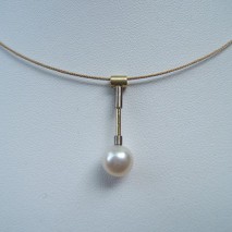 Het sieraad hangt aan een subtiel draadkabelsnoer.
