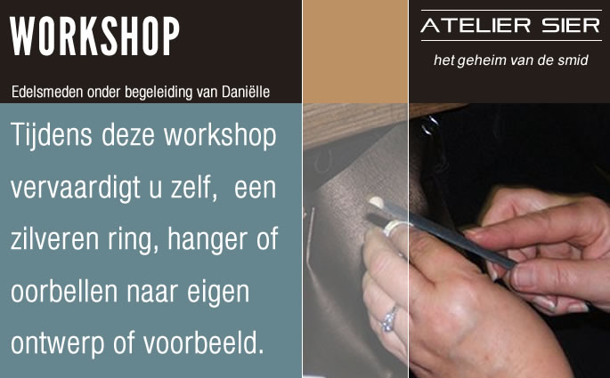 Tijdens deze workshop vervaardigt u zelf, onder begeleiding van Daniëlle, een zilveren ring, hanger of oorbellen naar eigen ontwerp of voorbeeld.